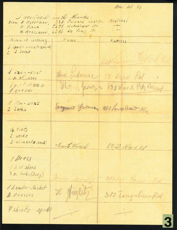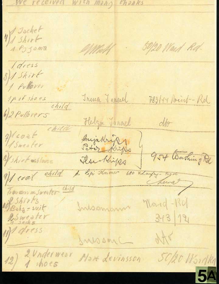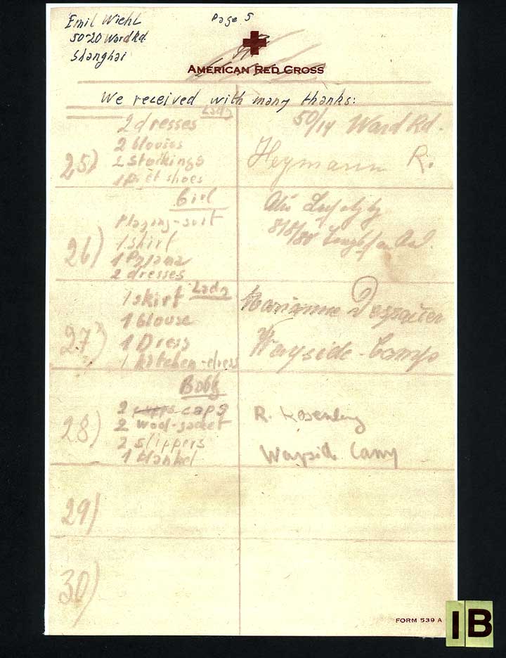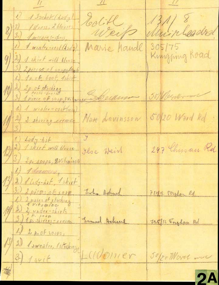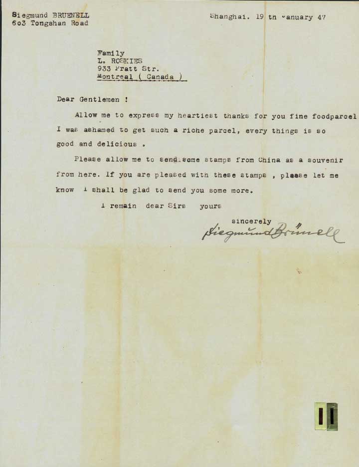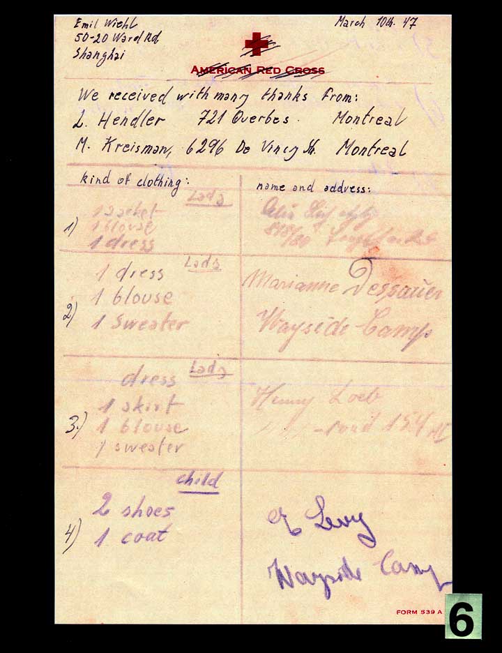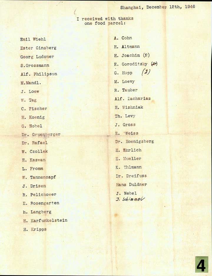 By Philatelic Judaica is a hobby that deals with postage stamps depicting the life and aspiration of Jews throughout the ages. It also includes important documents especially from the Holocaust era. Thanks to Ed Rosen, a fellow philatelist and stamp dealer in Redwood City, California, yours truly was able to obtain the following Shanghai memorabilia. The report that follows may hold a special interest to a number of Shanghailanders that were children at the time of their departure from Shanghai. They may not recall today the care-packages consisting of food and clothing their parents received from private citizens in Montreal, Canada. Several lists with actual signatures from the recipients acknowledging collectively the care-packages sent to them from Montreal, Canada are shown in Figures one thru six... The lists also state the item(s) received by the individual refugee, and their respective address. Names of Shanghailanders, alive today, that were youngsters when their parents emigrated to America or returned to their native country, also appear on a list. Sonja Muehlberger, now living in Berlin, who is popular among many Shanghailanders, especially for helping to locate the whereabouts or the fate of friends and relatives that immigrated to Shanghai prior to the war, is also shown by her maiden name on a list. Sonja was a small child at the time, and was represented on the list by her parents. After the war had ended, Emil Wiehl, an immigrant in Shanghai, corresponded with his brother in Montreal. With his help the Jewish Community in Montreal began to send care-packages to the refugees in the Shanghai Ghetto that were in need of food and clothes. Weihl, who lived at 50/20 Ward Road, and was also a recipient, acted as a trustee for receiving the care-packages and passing them on to the poor. At this point, it is assumed that Mrs. Hendler in Montreal was in charge of collecting the food and clothing from people in the Jewish Community and in sending them to Emil Weihl in Shanghai for distribution. The assumption becomes more evident in a letter sent to Mrs. Hendler by E. Weihl in February of 1947 in which he thanks her on behalf of all the refugees for the care-packages. The letter, shown in Figure seven, also lists another 29 recipients including Mr. Weihl. The envelope containing the letter and mailed from Shanghai, is shown in Figure eight. The reason for this particular method by which the gratitude for the care-packages and individual items was expressed, i.e. not directly from each individual but instead by signatures and by proxy, was explained in a letter from Emil Weihl to Mrs. Hendler. The letter is shown in Figure nine. Accordingly, most refugees were not able to write in English. Furthermore, Mr. Weihl was under the impression that a number of refugees may have swamped the caring people in Montreal not only with letters of thanks, but also with unreasonable requests. It was therefore, he added, that the people were asked to refrain from expressing their thanks individually, and that the letters containing the list of signatures would speak for all. There were some exceptions, however, like the letter sent from Mr. Ernst Mueller, to Mr. J Wiseberg in Montreal. The letter, written in September of 1946, is shown in Figure ten. Yours truly calls to the attention the command of the English language possessed by Mr. Mueller at the time he wrote the letter in the mid-forties. A similar letter sent by Siegmund Bruenell, 603 Tongshan Road, to L. Roskies in Montreal, is shown in Figure 11. In one of his later letters to Mrs. Hendler, E. Weihl wrote that food is no longer a problem because of the distribution of UNRRA rations. He also suggested in a letter to Mrs. Hendler, dated April 8, 1947, that all future care-packages should be diverted to Europe where the need for such items as clothes and food is far greater.