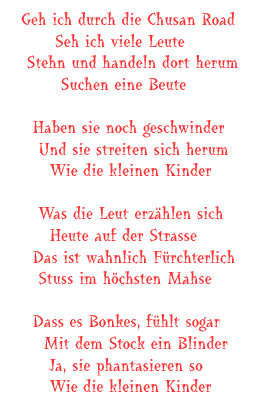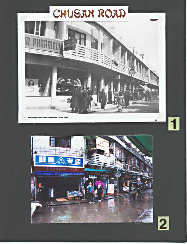 By The talent and endurance of Jewish refugees that Hitler could not take away from refugees fleeing to Shanghai as he did with their precious heirlooms, helped rebuild and transform the ruins left from the 1937 Sino-Japanese War into one flourishing store after another. In a short time, enterprising refugees from Central Europe revitalized Chusan Road, which became the commercial hub of "Little Vienna", with Viennese restaurants, bakeries, and a variety of stores. In figures one and two, we see a photograph of Chusan Road taken during the Hongkew era (courtesy, Horst Eisfelder), and again fifty years later (Photo ) respectively. Chusan Road was the place to go to learn about what people were saying about other people. It was also the street where one could hear the latest "Bonkes" (rumors), here illustrated by way of a cartoon in figure three. Gerhard Gottschalk popular comedian and administrator during the ghetto years referred to Chusan Road in one of his poems, "Wie die kleinen Kinder"