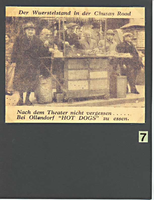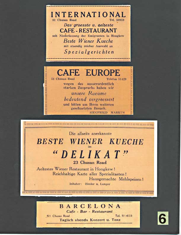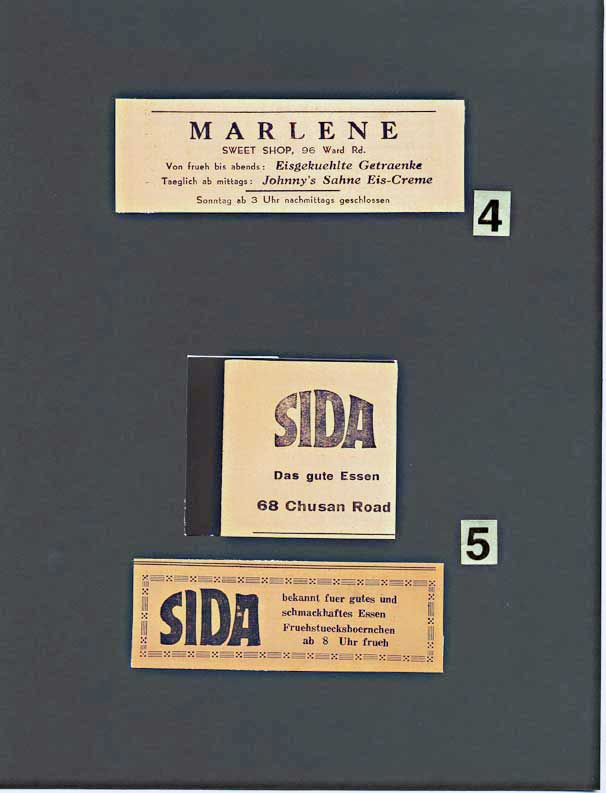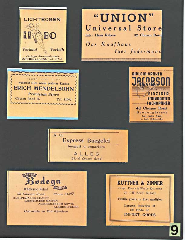 We begin our nostalgic tour on Chusan Road corner Ward Road with a visit to Marlene Sweet Shop (figure four) , where Zenta, an attractive young hostess, was serving Sahnen Ice Cream in a cone daily beginning at noon; indeed a rare and expensive treat in those days. As we continue walking on Chusan Road toward "den kleinen Wayside Park", we approach Hongkew‘s Restaurant Row where, with a few "Knackedicke Dollars", we could indulge ourselves in "ein heimisches Gericht" (native dish). On the left side of the street, on Chusan Road, was Sidas Restaurant (figure five) where, on climbing a very narrow and curved staircase, we could feast on an authentic Wiener Schnitzel. Across the street, were four of the most popular restaurants of Hongkew shown in figure six: International, Café Europe, Delikat, and Barcelona, all owned and operated by Jewish refugees who brought "die Feinkost" (gourmet taste) from their native country. For many refugees with a limited budget, and that was the greater majority, or those stopping for a late snack, Ollendorff (figure seven), located at the corner Chusan Road and Ward Road, always hit the spot. And who could forget "Die Wiener Konditorei" (figure eight), located at the heart of Chusan Road, where refugees, able to afford the mouthwatering pastries, spent their afternoon Kafeklatsch. Sahn Baiser, Schweine Ohr, Bienen Stich, and Pariser Spitz, their specialty, were among the wide assortment of Viennese pastries offered to their customers. Advertisements of different kind of stores on this particular and popular block called Chusan Road are illustrated in figure nine. There were, of course, other popular streets within the twelve block long and five block wide Hongkew Ghetto (figure ten), with a variety of stores and work- shops that met the needs for the twenty, or so, thousand refugees. There was Tongshan Road, Wayside Road, and Kumping Road, and perhaps a few others, however, Chusan Road will remain the most remembered and talked about street among all remaining Shanghailanders. To validate this assumption, we turn to the bimonthly Igud Yotzei Sin Bulletin where we find a column published regularly under the title, "Chusan Road Chatter ". A return visit in 1979 by Treasury Secretary W. M. Blumenthal to his parent’s flat (single room apartment) at 59 Chusan Road, while on an economic mission under the Carter Administration, brought back profound memories of his young adult life on this popular street. |
