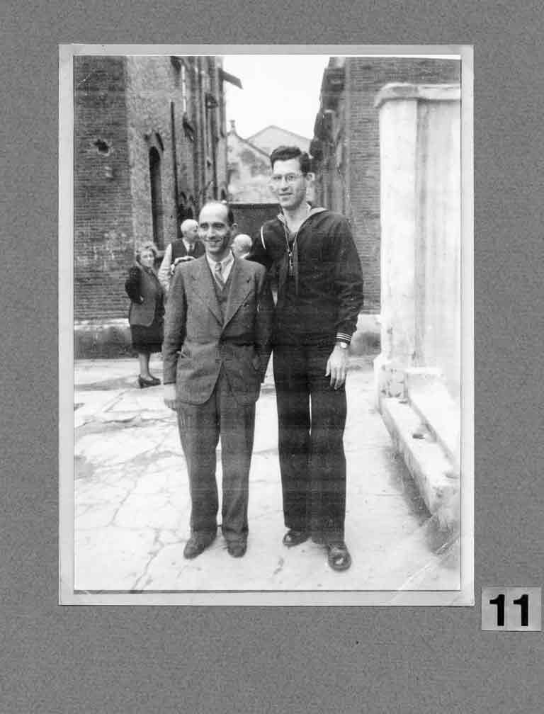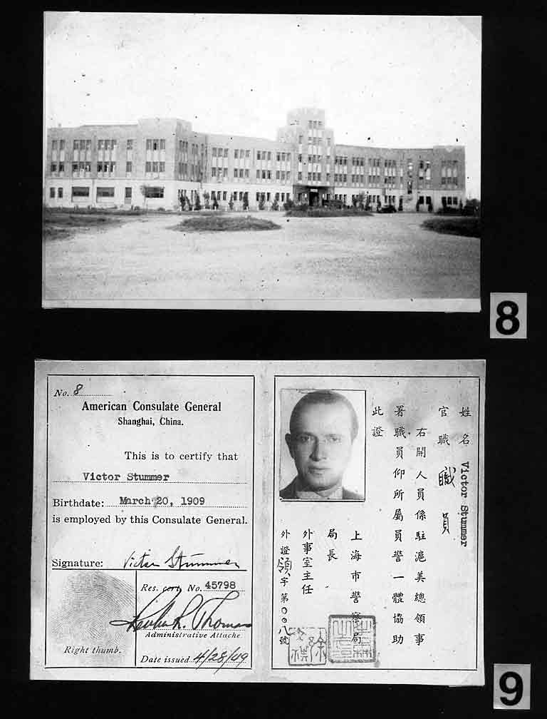 The horrific day began early in the morning when 25 new Douglas twin A-26 bombers, shown in figure three, from the 310 Bomb Group took off from Okinawa carrying 100 lb bombs. Most of the planes reached Shanghai around noontime, flying above a solid overcast that made visibility of their respective targets impossible. The only lead available to the bombardier was the approximate flying time from Okinawa to Shanghai. As a result, some of the 263 bombs dropped on Shanghai landed inside the populated Hongkew Ghetto. A more detailed account of the devastation caused by the stray bombs was printed in the weekly newspaper, "Our Life," National Independent Organ of Jewish Thought, shown in figure four. The following are some personal reactions of children to the bombardment as it occurred, recalled fifty-three years later by the same three Shanghailanders. "I wonder if anyone remembers being in Kadoorie School during the bombardment and hiding under our desks? I was ten years old at the time and have very vivid memories of the incident. My father came to get me during the bombardment and when it was over he carried me home, to avoid seeing the injured and corpses he covered my head and kept repeating, "Close your eyes." (Ruth Spiegler, June 98) "There has never been a July l7~" that I do not recall the bombardment. Like you, I remember hiding under the desk at the Kadoorie School. I do a great deal of lecturing to junior high and high school students about the Holocaust, and never fail to tell them the story of July 17, 1945." (Doris Fogel, August 98) "I was attending Kadoorie School where a lunch program had just started the day before for the children and I was to stay there for lunch. For some reason I just did not want to stay so I went home. My parents were both at home, my brother never used to come home for lunch, but that day he did. It was very unusual for all of us to be home at the same time since my father and brother would be at work. All of a sudden the bombs were falling. The four of us embraced in a circle, and held each other very close so that if we would have been hit, we would all be together. Everything turned pitch black, when it was over I felt like G-d protected us by holding his hands over us. I was very lucky not having to be walked home from Kadoorie School and having to see the devastation and dead on the sidewalk, like many children did. I will never forget July 17, 1945." (Lea Baumann, September, 98) Following Pearl Harbor, air-raid security in Shanghai required all windows to be covered with black-out material during the period following an air-raid alarm. The physical and war related environment was depicted in a drawing by a nine year old boy that lived in the Hongkew Ghetto when all the air-raids occurred. The drawing, shown in figure five, shows a canon and a Japanese Sentry standing guard and holding an open bayonet. Joy and jubilation spread instantly throughout Hongkew when the news about the Japanese surrender was made public. It was only a few weeks later when US. air freighters, fighter planes and bombers, that were in charge of convoy and combat missions in the China-Burma-India Theater arrived at Chiangwan airfield in the Northern part of Shanghai, carrying the American Armed Forces of Liberation. A photo of a row of C-46 air freighters, ready to be overhauled by a crew of refugee mechanics posing in a jeep, is shown in figure six. A photograph of a four-engine US. bomber with my stepfather, Victor Stummer, standing in front of the plane, is shown in figure seven. Chiangwan airfield was one of the targets sought by US. Air Force to be bombed on the 17th of July. A large building at the airfield, illustrated in figure eight, became the US. Headquarters after the American Forces arrived in Shanghai. Located in the building was the office of the American Consulate General that employed a number of civilians and Jewish refugees. Figure nine shows an identification card stating that my step-father is employed by the American Consulate General. In figure ten, we see a group of refugee workers, including my stepfather, posing with US. Air Force officers and crew in front of the building. Salaries paid to civilians by the US. Armed forces in Shanghai were high, affording a very comfortable living for many refugees after the war. Friendship with the US. Forces was made very fast, as shown in a photograph in figure eleven. Here we see a young American sailor visiting a Jewish refugee in a typical house-lane as other refugees were curiously looking on.