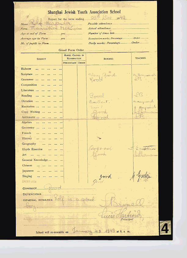 had large business interests in the Far East. In 1941, the school building on Kingchow Road had to be returned to the Chinese, and the school had to find a new facility. Horace Kadoorie came to the rescue again by raising the necessary funds required for a new place to house all the young students. A “U” shaped, one story building with modern facilities was built at 627 East Yuhang Road, conveniently located in the heart of the Jewish ghetto, also called “Designated Area “. The school with a student-body of approximately 600, and 17 teachers under the able direction of Ms. Lucie Hartwich, which included two kindergarten classes, shown in figure two, opened on January 2, 1942. A wide array of the basic subjects, secular in orientation, as for example art and creativity, illustrated in figure three, were offered to the students. Many of the other subjects taught are shown on a report card in figure four. Religious festivals, however, were also observed, as for example Purim, shown in figure five, when students dressed in costumes portraying biblical characters in the school auditorium. There were also Friday evening Shabbat services at the school, with students doing the early part followed by a regular adult service. Another popular and highly respected member of the community and of the Kadoorie School faculty was Leo Meyer, a well- known soccer player and teacher who encouraged sports activities among the young, and much needed moral guidance to children who were in need of it. In 1980, a former student of Kadoorie School sent a letter to Horace Kadoorie, inviting him to address the Shanghailanders at their first major reunion in Oakland, California. Kadoorie‘s response is shown in figure six. It was there, at the reunion, where Sir Horace Kadoorie met Ms. Lucie Hartwich again, shown in figure seven, and many of her students. Yours truly was lucky to meet after so many years his teachers and mentors, Lucie Hartwich in 1964 at Lake Tahoe, and Leo Meyer in the mid-70‘s in Los Angeles, shown in figure eight and nine respectively. In the meantime, Sir Horace Kadoorie, leaving behind a great legacy passed away in Hong Kong in 1995. Ms. Lucie Hariwich, a true legend, who today after fifty plus years is still often remembered by her former students, passed away in August of 1984 in San Francisco. References: |