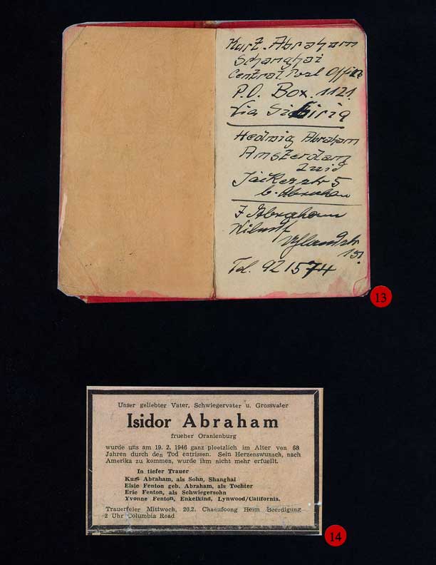 It all happened on September 25, 2006 while Yvonne Harpuder from Los Angeles, California was with her husband on a trip to Berlin and Vienna. While in Berlin, she was promised by her husband a side-trip to Oranienburg, 35 km north of Berlin, to find the house her grandparents were living in and had their store before the start of the Nazi pogroms and the infamous Kristallnacht. She had no clue how to find the building except for a very small black and white photograph that showed the exterior of the store. The photo was embossed on a little red address book she got from her aunt after her uncle passed away (Figure one). The store according to her mother sold men’s clothing and hat gear, and was situated in an impressive and stately corner building adjacent to a palace (Figure two), and a few steps from the Havel River (Figure three). Upon arrival at the train station in Oranienburg (Figure four), she showed an elderly lady shopping nearby the picture on the address book. The woman immediately recognized the area and thereafter gave Yvonne directions to the building. After a ten-minute walk, she excitedly approached the yellow, multi-story edifice, at Bernauer Strasse 2, that looked identical to the photograph on the address book (Figure five). After taking a few snapshots of the building and the front of the store, which is now a bicycle shop (Figure six), Yvonne walked inside and introduced herself to the friendly storekeeper. When she told him that this was her grandparent’s store, he asked the 62-year-old American to step outside the shop with him for a moment where he then pointed at two small brass plates embedded in the cobblestones on the sidewalk. Tears began to flow down her cheeks when she read the names of her grandparents, Isidor and Hedwig Abrahm, inscribed on the plates called “Stolpersteine” (Figure seven and Figure eight). Stolpersteine are cobblestones covered with a layer of brass and an inscription commemorating a person who used to live in the house behind the stone and had been persecuted or killed by the National Socialists. “I was overwhelmed”, she told the Oranienburger Press at the Berlin Intercontinental Hotel during an extensive interview the next day. (Figure nine). Several other local newspapers and the Internet followed the story and also began to publish her emotional experience at Bernauer Strasse (Figure ten). She has never heard about Stolpersteine, nor has been to Oranienburg. All she wanted at the time was to find the store of her grandparents, the rest was serendipity. It may be recalled that Sachsenhausen was a short distance from the mainstream of Oranienburg where in 1936 the Nazis established their first notorious concentration camp. Yvonne was told very little by her mother, Ilse about life in Oranienburg during the Nazi period. Instead she spoke about the more carefree and happy days during her early youth while living in that city. One of the highlights she often mentioned was when as an athletic teenager she jumped off from a bridge into the Havel River already mentioned above. A cramp in her leg almost caused her to drown when luckily a fisherman pulled her out from the water. Yvonne remembered her mother’s story well while standing at that same bridge during her visit to Oranienburg (Figure11). She also remembered the palace that her mother spoke about when she was alive (Please refer back to Figure three). Both the bridge and the palace were untouched during all those years. Looking back in years, it was 1938 when it was time to leave Germany because of the Nazi dreadful policies against Jews. Yvonne’s grandmother, Hedwig managed to leave with her children in 1938 to Amsterdam. A form had to be completed and submitted to the Nazi authorities before they left, stating the move from Germany to Amsterdam, and their religious affiliation which was crassly indicated, “Jude”. It was then cancelled with the Swastika and Nazi eagle (Figure 12). Later that year Hedwig failed to secure a visa to America and therefore, had to remain in Amsterdam while her children (Yvonne’s parents) continued with their emigration to America. Yvonne’s grandfather, Isidor immigrated with his son to Shanghai. The son’s address in Shanghai along with Hedwig’s address in Amsterdam is shown on the same page in the little red address book mentioned above (Figure 13). Yvonne’s grandmother, Hedwig died in Amsterdam at an unknown date. Isidor, Yvonne’s grandfather, survived the war but died shortly after in February 1946 while he was still in Shanghai (Figure 14). How did Oranienburg get its Stolperstein? The best way to answer this question is to quote part of a letter written in German that yours truly received from a high school teacher in Oranienburg by the name of Silke Schroeder (Figure 15): “When I had the opportunity to address the parent-teacher association at the Rungegymnasium in Oranienburg where I am a teacher and my son a student, I made a suggestion to raise money for a Stolperstein in our city by having a bake sale. The parents and students agreed, hence the children and mothers began to bake thirty delicious cakes that were sold to everyone in the school. When I came to the school in the afternoon, all the students were very enthusiastically involved with the project. A few gathered the crumbs from the cake while the other students counted the money from the bake sale. It was something for everyone to see. Yes, we have reached our goal and thus we had enough money for a Stolperstein. On May 10, 2006 Guenter Demnig laid the brass plated cobblestone into the pavement at Bernauer Strasse (in front of Yvonne’s former grand-parents store). All the students including the school principal took part in the ceremony. Now, the name Hedwig and Isidor Abraham will be remembered by the students that participated in this meaningful undertaking.”
