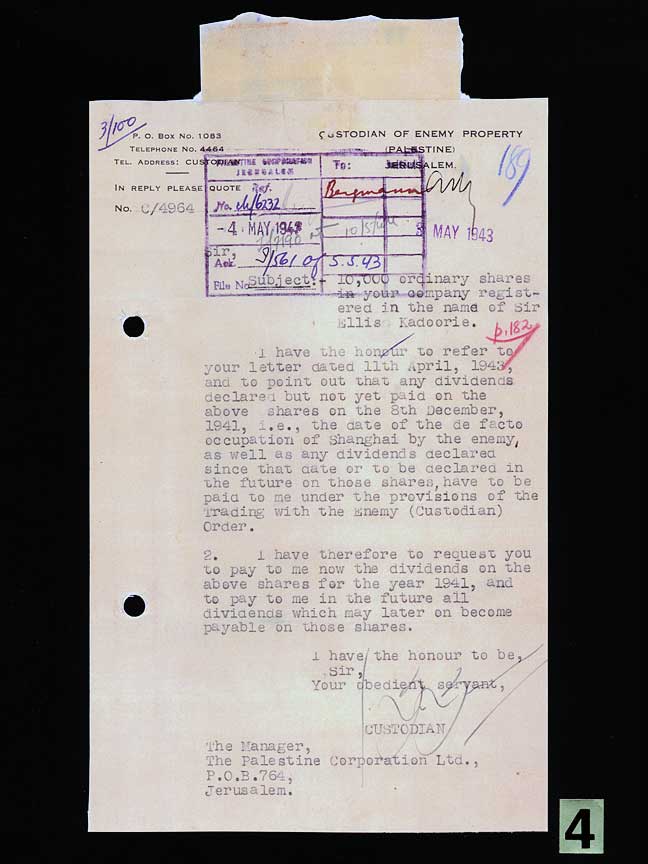 The letter, written by the Custodian of Enemy Property in Palestine,