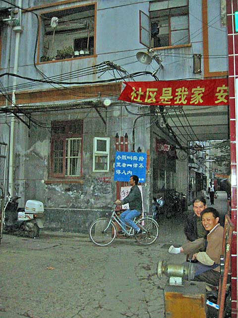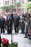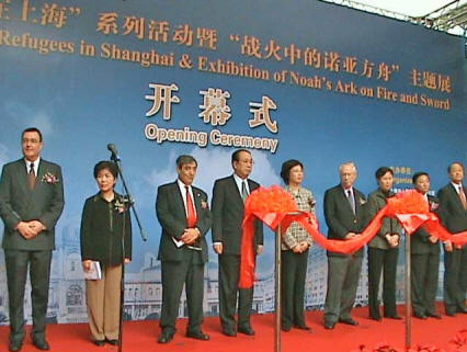The dignitaries stood shoulder to shoulder in the still warm sun on a stage set up in the courtyard of the Ohel Rachel synagogue. It was a festive occasion, this morning on November 10 in Shanghai. The stage with a blue backdrop declared "Jewish Refugees in Shanghai and Exhibition of Noah's Ark on Fire and Sword" It was the opening ceremony to commemorate the 60th anniversity of the end of World War II.