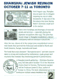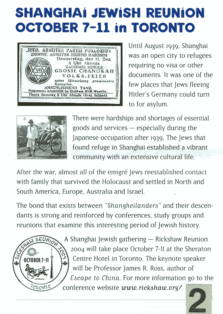 Rickshaw Reunion 2004 committee to provide an envelope with an attractive cachet, indicative to this momentous event. The envelope could serve to mail a greeting to a fellow Shanghailander not able to attend the reunion, or to keep as a souvenir. Luckily, there was someone 1 could turn to, his name, Irving Osterer, who is a graphic artist and also a fellow philatelist (stamp collector). When I told Irv about the idea of an envelope and asked for his kind help, he immediately obliged. Soon after, he designed the cachet incorporating material he found on the Rickshaw Website, and added the skyline with the CN tower to the current Rickshaw Reunion logo. The complete envelope is shown in figure one. Part of the cachet depicts Hongkew gossip with the connotation, “Wissen Sie schon?” (Do you know the latest?) The stamp, superimposed by the logo, was issued in China on July 4, 1939, the year when the largest contingent of refugees immigrated to Shanghai (for the stamp collector, it is China, Scott 365). The small photograph on the top, right side of the cachet, shows a Shanghai Jewish refugee, Victor Stummer, seated in a rickshaw, who happened to live in Canada prior to settling in the United States. When I asked Irv Osterer how I can reciprocate for all his valuable time he spent creating this smart and fitting cachet, he replied: “Ralph - I was happy to help you out with this, and if I can contribute in a small way to this very momentous gathering of Jewish people, I am also very grateful. For occasions such as this, Jews have an obligation to help fellow Jews." Osterer was born in Ontario, Canada. He attended Ottawa‘s Jewish day school, Hillel Academy and later graduated from Ontario College of Arts. An art teacher and a devoted father, he also writes for the news bulletin of his temple. His article about our upcoming reunion in Toronto is shown in figure two.