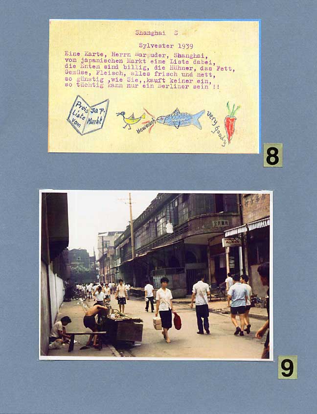 By now it may seem apparent to the viewers of the Rickshaw Express that many of the articles presented on the Website consists of philatelic items including postcards sent to and from Shanghai. Being a Shanghailander and an ardent philatelist, yours truly is always searching for postal memorabilia, which tells something about Shanghai, especially life during the war and pre-war era. Through the magic of the computer, and contact with several philatelists (stamp collectors), around the world, I was again fortunate in obtaining the following rare picture postcards from the bygone era, some in mint condition, and others, which went through the mail. We start off with a postcard illustrated in figure one showing the Astor House Hotel, the way we Shanghailanders remember it. Situated in an inconspicuous corner near the famous Bund and across the former Russian Embassy, the building we saw then was completed in 1910. It was once the most renowned and luxurious foreign-owned hotel in the Far East. In 1959, the hotel name was changed to Pujiang Hotel. Missing in the foreground is the Russian Embassy; built later, shown on an old and on a recent photograph in figure two. Also recently acquired was another set of vintage picture- postcards illustrating again the popular Bund The Hong Kong-Shanghai-Bank, with its dome-shaped roof is presented on the postcard in figure three, with the Custom House to the right, in the process of being rebuilt (circa 1925). The postcard illustrated in figure four shows the new Custom House situated along the Bund, with the city‘s most famous clock-tower. It was completed in 1927. During its 1930‘s and 1940‘s heyday, Nanking Road housed the Shanghai‘s four main department stores -~ Wing On Co., Sun Sun Co., Sincere Co., and Da Sun Co. Across the road from the Sincere Co. was Wing On Co., shown from an aerial view on the postcard in figure five. Established in 1918, it became the most prosperous department store in Shanghai. On a personal note; in the early 40‘s, yours truly consumed at Sincere Co. with a voracious appetite, his first hot dog better known at the time as a “Knack im Frack”. Prior to the Japanese Proclamation of 1943 restricting Jews to a designated area, several markets located in the International Settlement were readily accessible to the newly arrived refugees of the late 30‘s. Among those was the popular Hongkew Market illustrated on the postcards in figure six and figure seven. It became well patronized by many Jewish refugees prior to the war. A fun postcard dedicated to my father at a 1939 New Years party, shown in figure eight, tells how he enjoyed shopping for food at the Hongkew Market, referred to at the time by the Jewish refugees as “Der Japanisher Markt”. During the time when the Proclamation was implemented, there was only one market in the designated area called Chusan Road Market available to the refugees. The market shown on a recent photograph in figure nine (courtesy: Horst Beil) was conveniently located in the heart of Hongkew on Muirhead Road Who can remember the rich aroma of the strawberries from a block away emanating from the market? It was the human fertilizer, which rendered the fruity, and very berry aroma and taste of the fruit. With hope that by gathering and collecting anything related to Shanghai, especially photos, postcards, letters, and other documents from the 30‘s and 40‘s, we can one day tell more to our posterity about the city that saved several thousands of Jewish lives. |