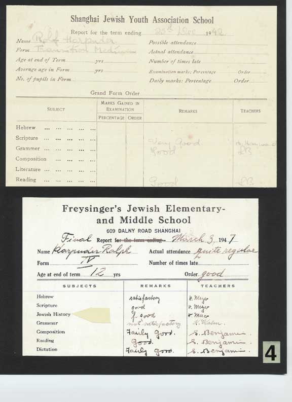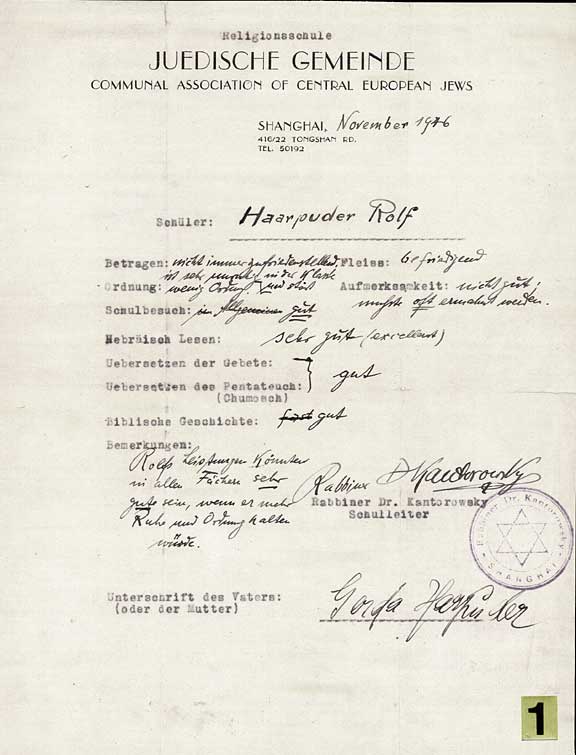 Rabbi Georg Kanterowski, a liberal Rabbi, who served the refugees during the High Holidays, taught afternoon Hebrew school at the Freysinger School building on Dalny Road. A report sheet, printed and filled out in German, is shown in figure one. It shows how yours truly faired in reading Hebrew, prayer, and Pentateuch interpretation, and Bible study. Comments by Dr. Kanterowski, who taught the subjects, were added at the end of the report.