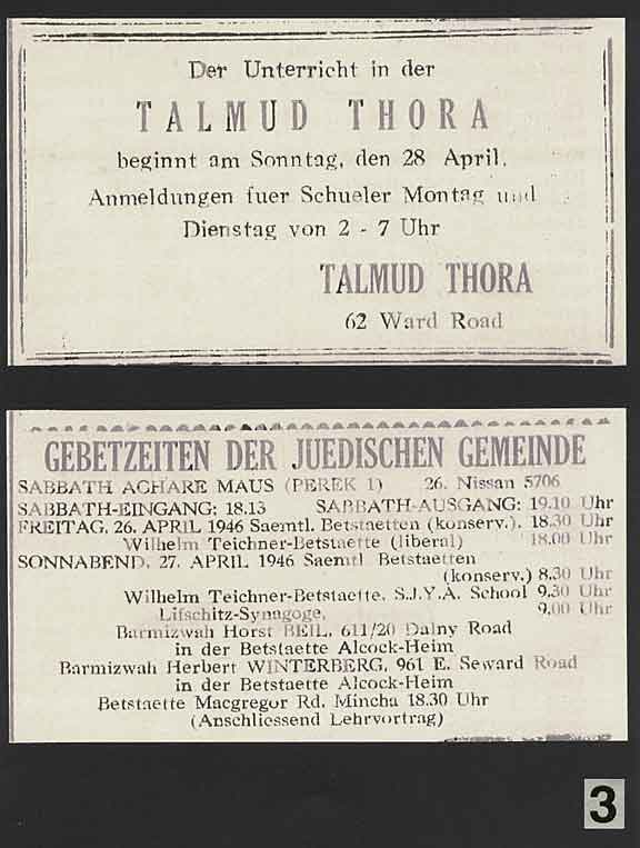 Two announcements illustrated in figure three lists the schedule of classes at Talmud Torah; a schedule of Sabbath services at other locations, and an announcement of two Bar Mitzvahs.